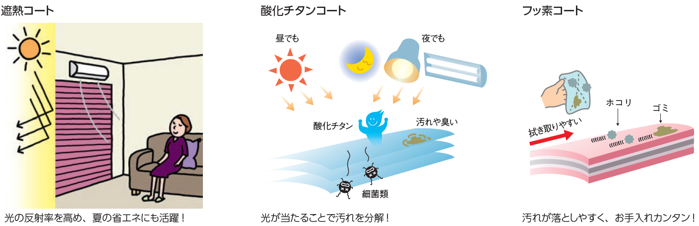 防汚・抗菌・消臭に効果的な「酸化チタンコート」や、汚れが落としやすい「フッ素コート」など、お手入れが簡単なスラットもラインナップ。